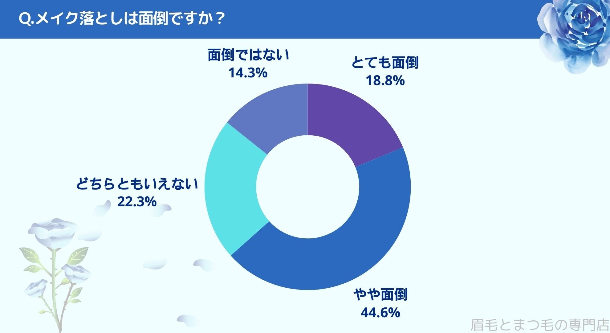 メイク落としが面倒可お聞きしたところ「とても面倒(18.8%)」、「やや面倒(44.6%)」、「どちらともいえない(22.3%)」、「面倒ではない(14.3%)」という結果になりました。