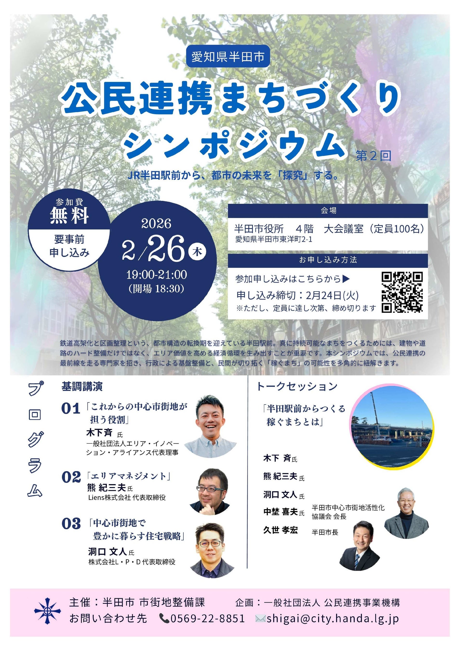 JR半田駅前は、これからの半田市の顔となる重要なエリアです。鉄道高架化と土地区画整理事業という大きな整備を、将来にわたって価値のあるものにしていくためには、行政だけでも、民間だけでもなく、公民が同じ方向を向いて取り組むことが欠かせません。本シンポジウムが、JR半田駅前で「何ができるのか」、「誰と、どう実現していくのか」を考えるきっかけとなり、多くの方がこのまちの未来に主体的に関わる第一歩となることを期待しています。