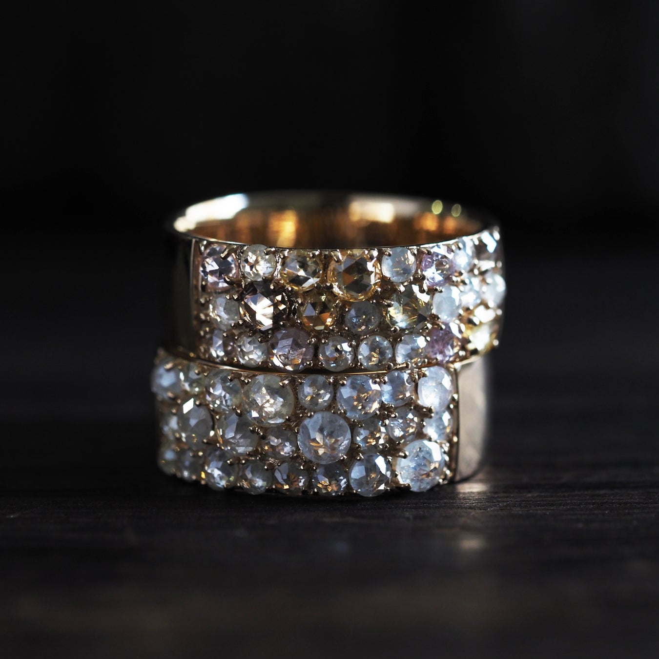 例えば、新宿店限定の「Palette(パレット)」。中世の貴婦人たちを虜にしたローズカットのダイヤモンドを、K9ゴールドの厚みある土台にぎっしりとパヴェ留めしたリングです。