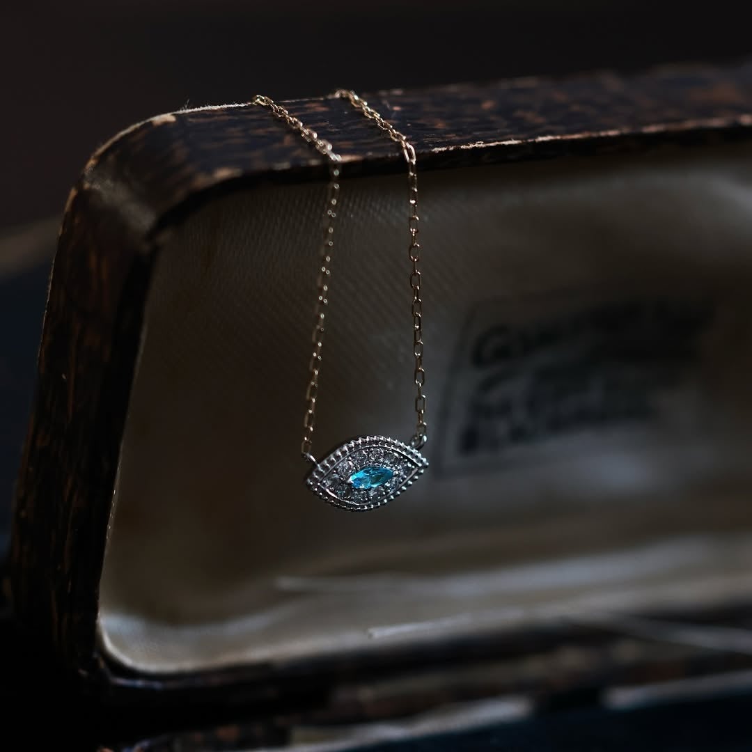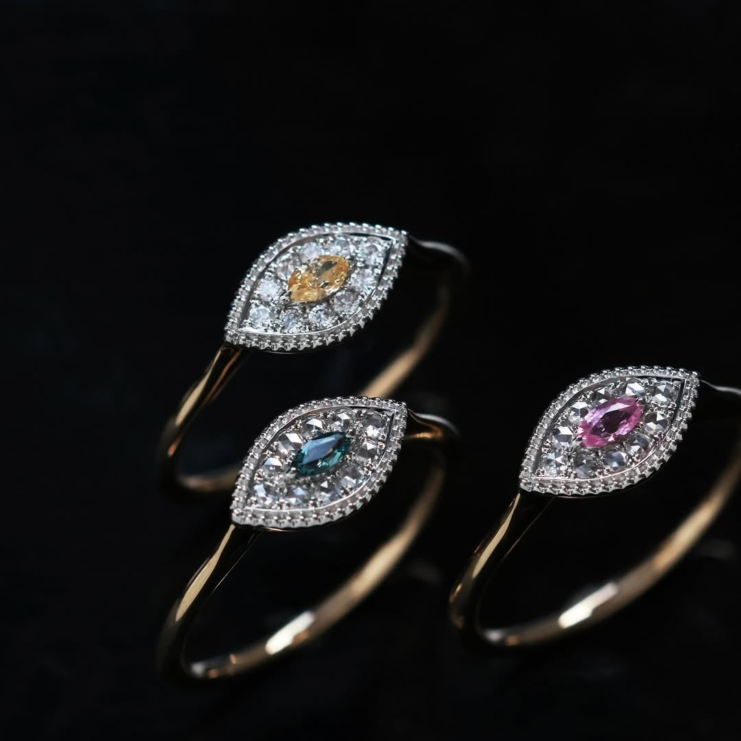 マーキースシェイプのフレームに抱かれたのは、パライバトルマリン、アレキサンドライト、ダイヤモンド、サファイアといった特別な宝石たち。なかでも、内包物の多さからマーキースカットが施されることが稀なパライバトルマリンは、買い付けの場でも出会いが限られる希少な存在です。