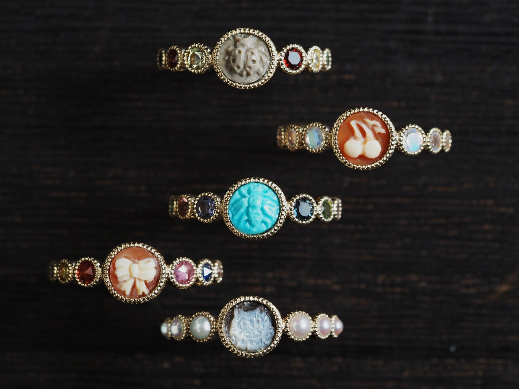 ラーヴァ(溶岩)、珊瑚、ターコイズ、シェルといった素材をモチーフごとに使い分け、1点ずつ異なる表情を持つカメオに、腕部分には色とりどりのカラーストーンやパールを合わせました。温かみあるカメオの表情を引き立て、柔らかな光が指先に広がります。