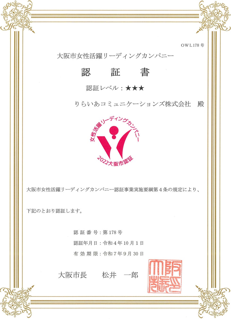 りらいあコミュニケーションズ、大阪市が推進する「女性活躍リーディングカンパニー」の最高位「三つ星」認証を取得