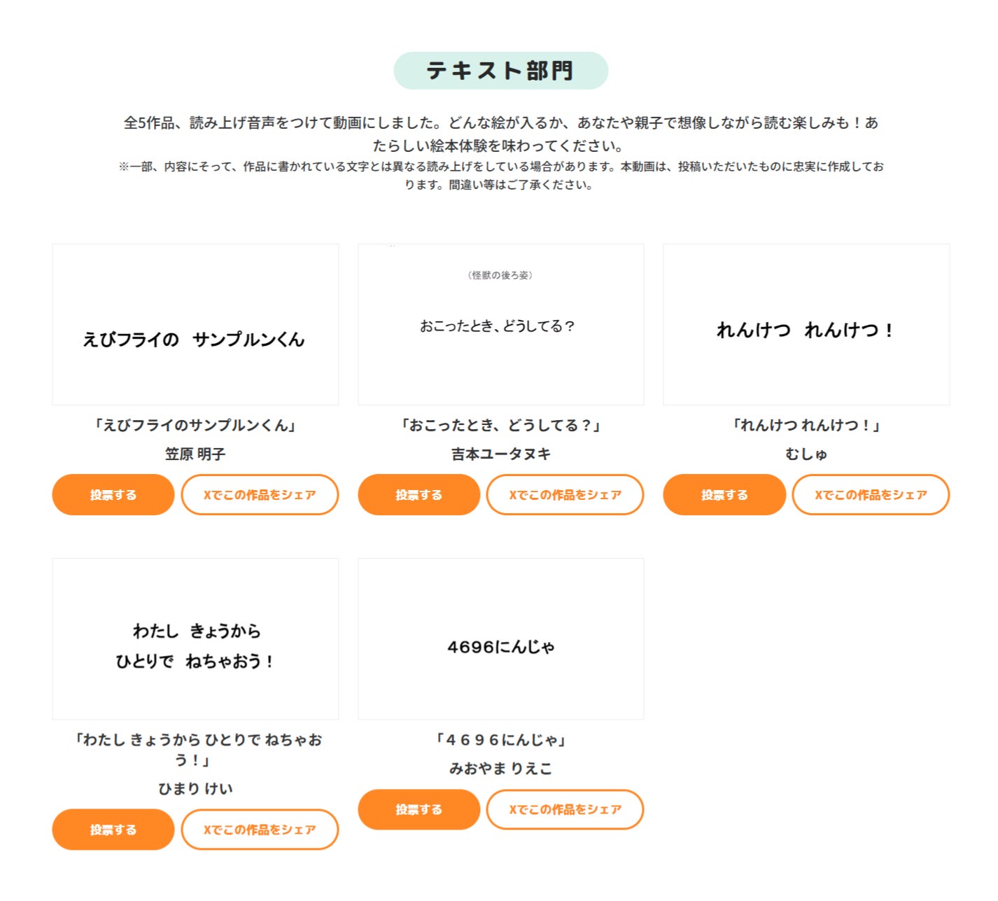 「朗読のお話をいただきすぐに各作品を拝見したのですが、この作品はここが魅力的だな、こんな空気感が合うな、この子はきっとこんな性格なんだろうな、というのがすぐに思い浮かぶ、読み手の想像力を掻き立てる作品ばかりでした。テキスト部門の作品も絵本部門の作品も、朗読しながら私の頭の中でキャラクターたちが自由に動き回っていたので、読み上げ動画を聞いていただいた方にもぜひその感覚を味わっていただけたら嬉しいです!」