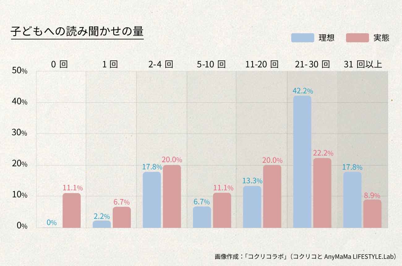 コクリコ×AnyMaMaとの調査では、「月にどのくらい読み聞かせをしているか」という設問に対して、約9割の母親が月に1冊以上は読み聞かせをしています。読み聞かせを1ヵ月に21回以上してあげるのが理想、と答える母親が60%もいるのに、それを実現しているママは31.1%。