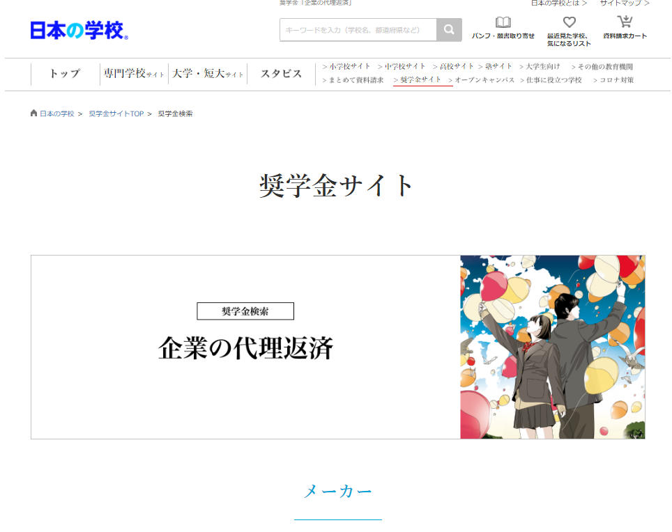 奨学金サイト「企業の代理返済」:https://school.js88.com/shogakukin/search?search_kind=3