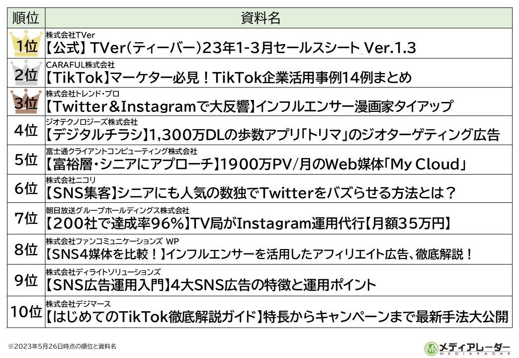 株式会社アイズ(所在地:東京都渋谷区、代表取締役社長:福島範幸、東証グロース:5242)が運営する国内No.1*¹の広告媒体資料・マーケティング資料のポータルサイト「メディアレーダー」は、通常プランで登録している資料を対象とした2023年1月~3月累計での資料別ダウンロード数を集計し、2023年5月26日(金)時点で公開中の資料をランキング形式で発表しました。
