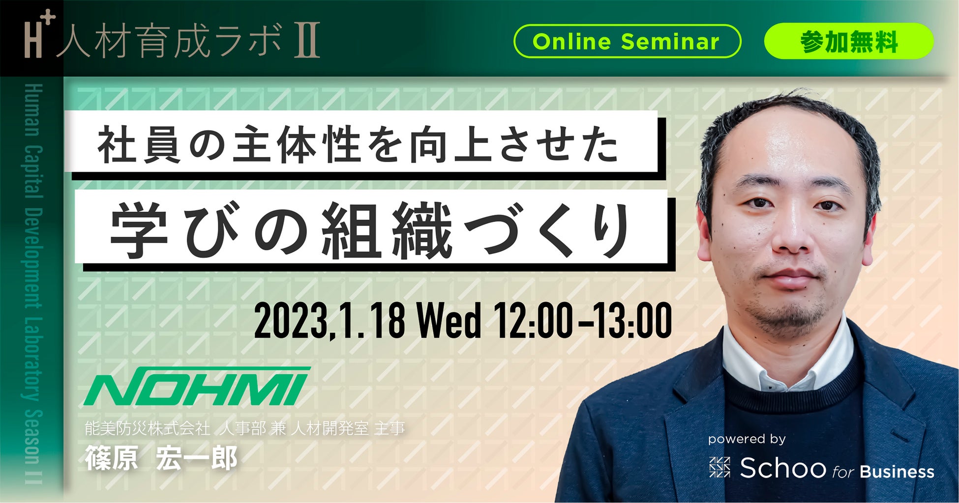 インターネットでの学びや教育を起点とした社会変革を行う株式会社Schoo(本社:東京都渋谷区、代表取締役社長CEO:森 健志郎、以下「スクー」)が提供する法人向け研修サービス「Schoo for Business」は、人的資本経営や組織開発に関連する情報発信やイベントを開催する「人材育成ラボ(H+)」を運営しています。この度1月18日(水)に、社員が自ら学び自ら挑戦する風土づくりのプロセスを学ぶウェビナーを開催します。創業100年、防災メーカーとして国内シェアNo.1を誇る能美防災株式会社で人材育成組織の担当を務める篠原氏をゲストにお招きし、同氏の経験から得られた「3つの秘訣」をお話いただきます。参加費は無料です。