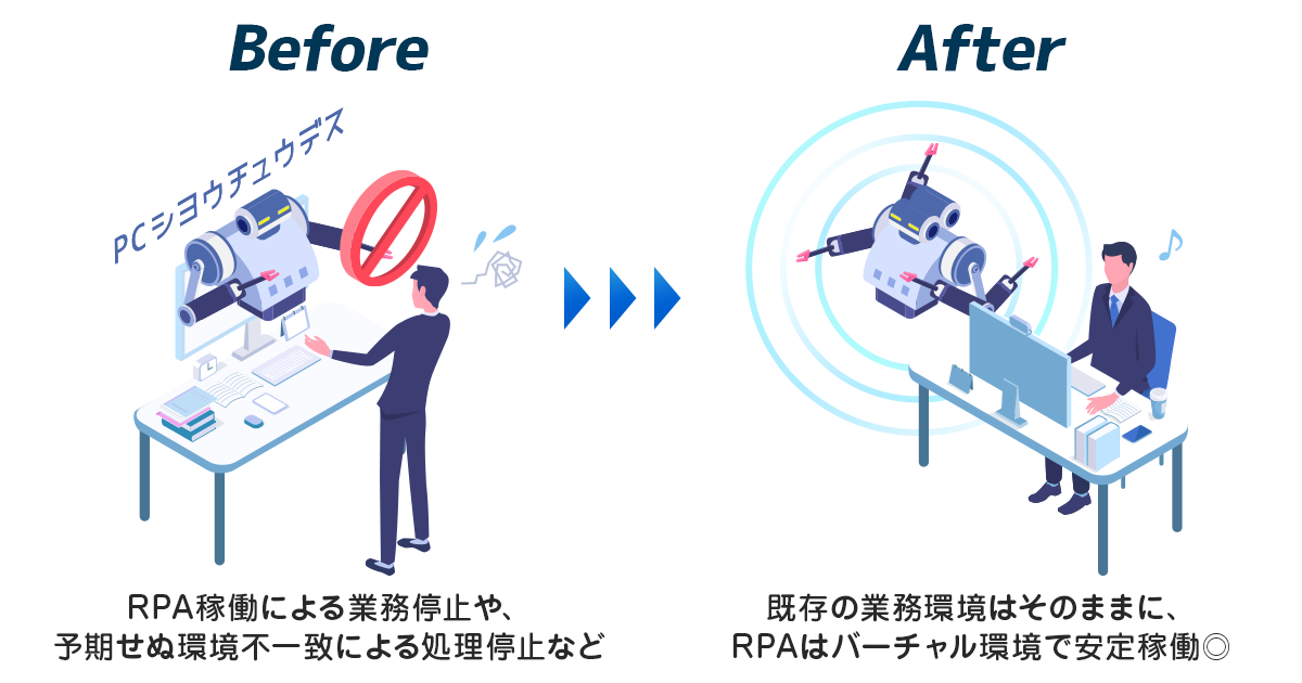 RPAによる業務の自動化は、こうした課題の有用なソリューションである一方で、実用化には「PC環境によってRPAがうまく稼働しない」「RPA稼働中はそのPCで他の作業が出来ず業務が止まってしまう」など、さまざまなハードルがありました。