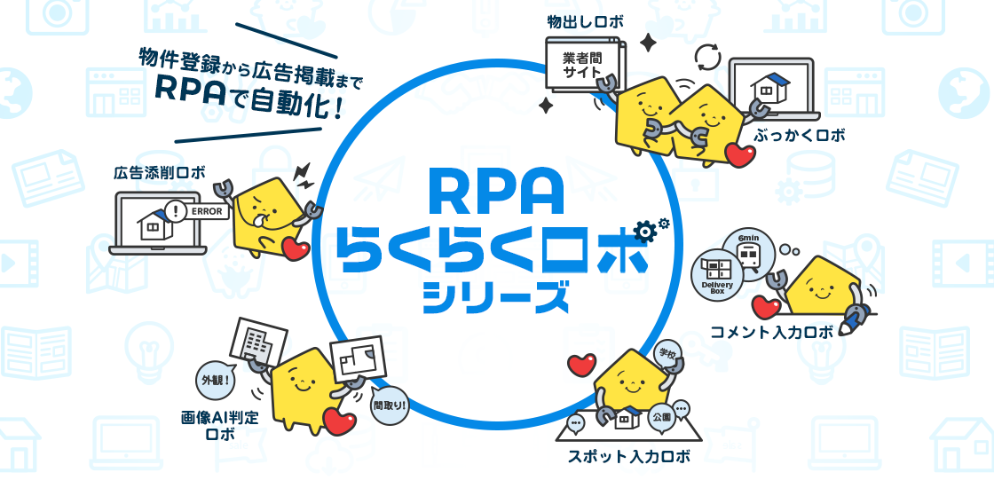 「RPAらくらくロボシリーズ」は2020年4月にリリースした、不動産業務に特化したRPAサービスです。業界垂直統合SaaSシステムである「いえらぶCLOUD」と合わせて活用することで、不動産業務に関わるあらゆる情報をワンストップで管理することが可能です。