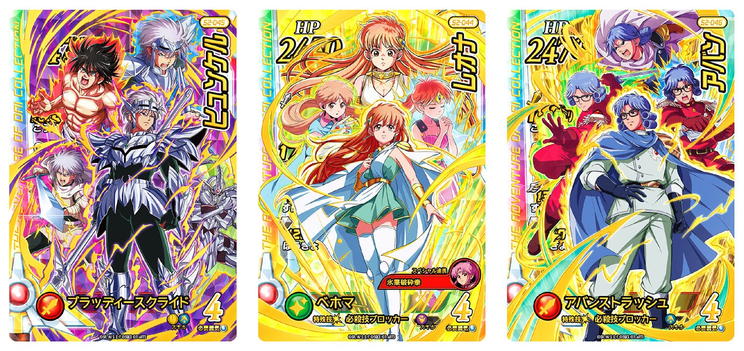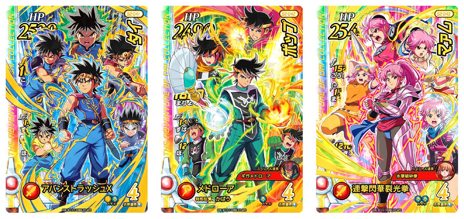 「超2弾」では、 主人公「ダイ」をはじめとしたメインキャラクターたちのメモリアルなデザインのドラゴンレアカード6種をはじめ、「真・大魔王バーン」を筆頭に新たなダークギガレアカードが登場します。さらに「ドラゴンクエストIV 導かれし者たち」が “超”シリーズに初参戦します。