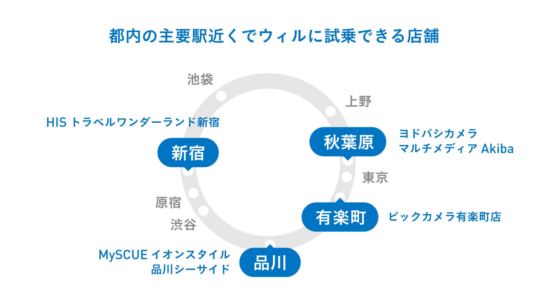 WHILL社は東京23区内でもウィルの試乗拠点を拡充しており、「ビックカメラ有楽町店」、「HISトラベルワンダーランド新宿」、「MySCUEイオンスタイル品川シーサイド」をはじめ、都内各所でウィルを気軽に体験いただけます。