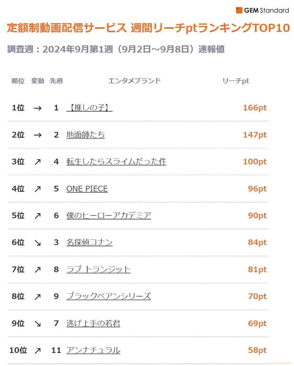 エンタテイメント業界に向けたデータ×デジタルマーケティングサービスを提供するGEM Partners株式会社(ジェムパートナーズ、所在地:東京都港区、代表取締役:梅津文)は9月12日、複数の定額制動画配信サービスを横断集計した2024年9月第1週(9月2日~9月8日)速報値のエンタメブランド別(※1)の週間リーチptランキングTOP10を発表します。