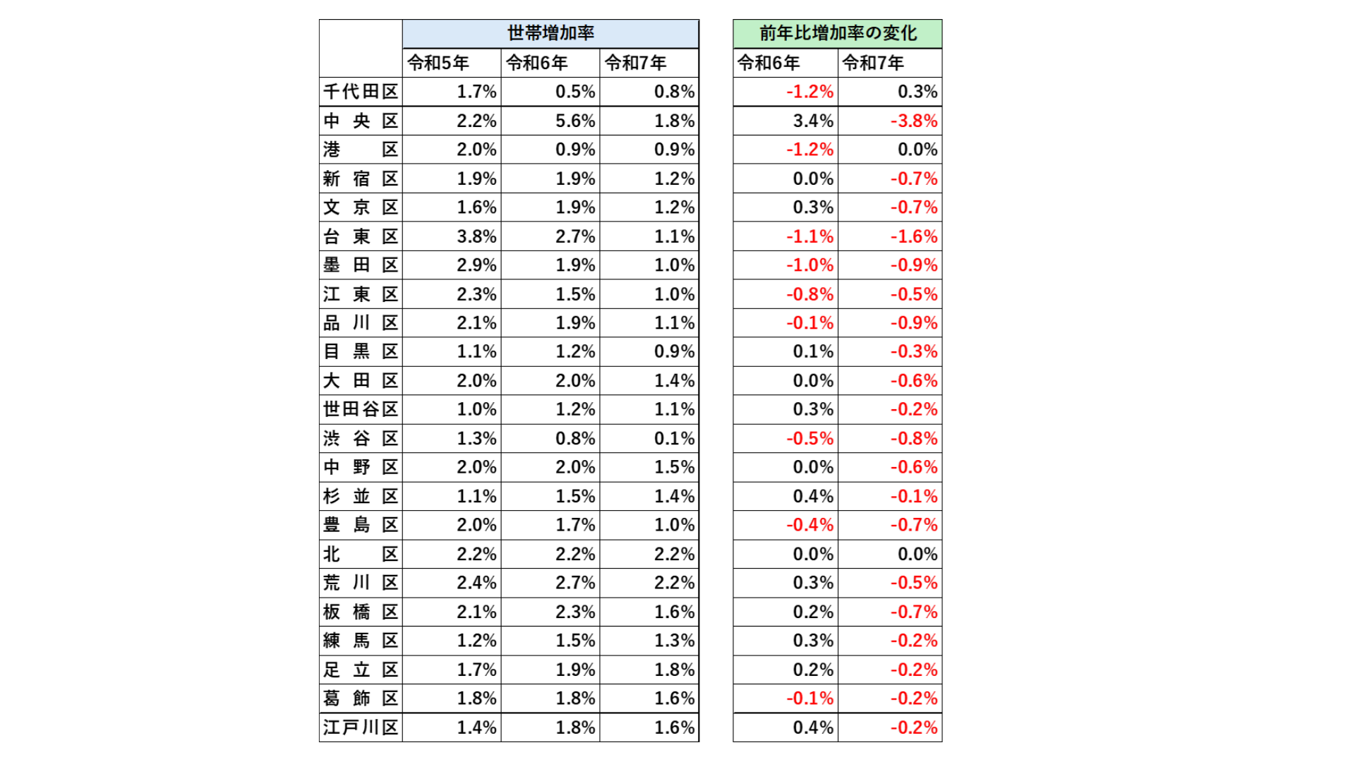 特に顕著なのが中央区の動向です。令和7年においても世帯数自体は増加しているものの、その増加率の低下幅は23区内でも際立って大きく、いわば「減速の象徴的エリア」となっています。