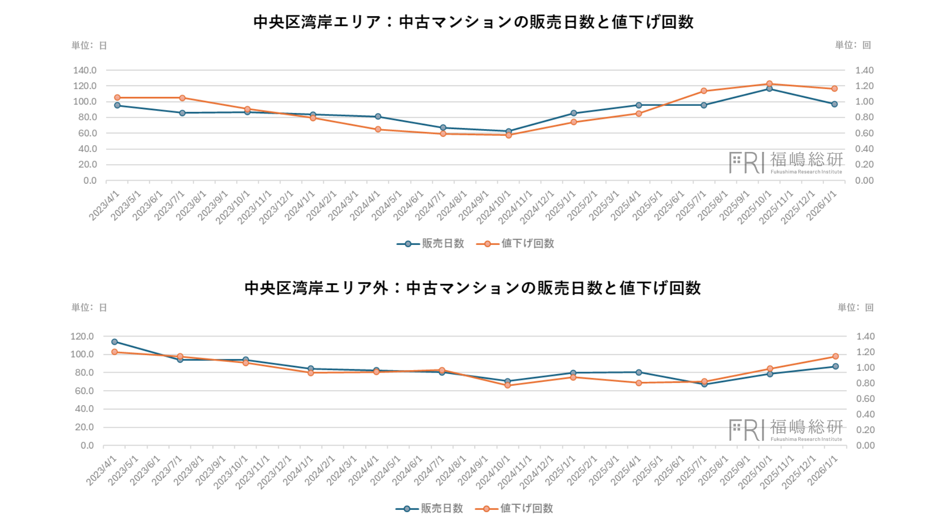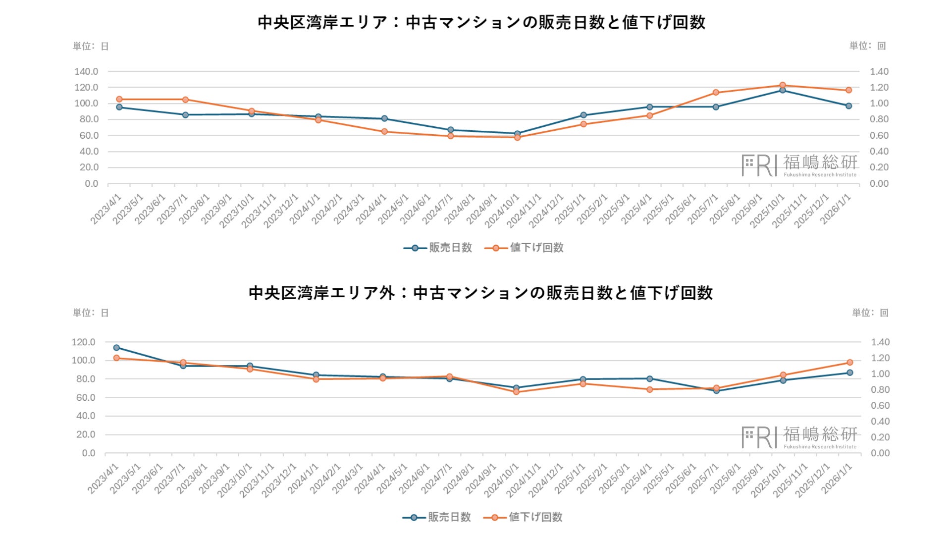 さらに注目すべきは、この流動性低下が湾岸エリアにとどまらない点です。中央区内の内陸エリアにおいても、2025年中盤以降は販売日数の長期化および値下げ回数の増加が確認されています。