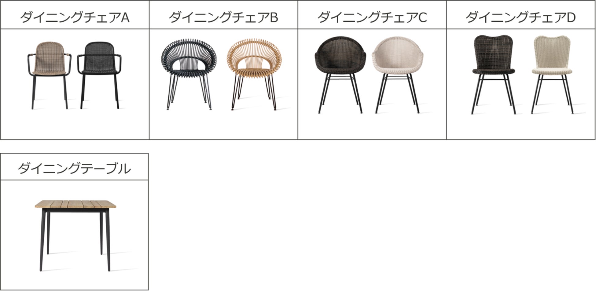 細身のラタン編み、スリムなフレームで高級感を感じる4デザイン2色の椅子。人工ラタン、アルミフレームを使用しているので、汚れても簡単にお手入れできます。