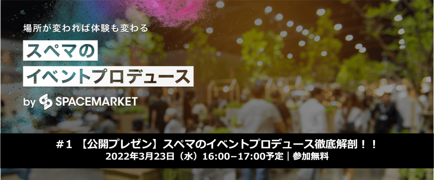 あらゆるスペースを貸し借りできるプラットフォーム「スペースマーケット」を運営する株式会社スペースマーケット(本社:東京都渋谷区、代表取締役社長:重松大輔、以下、スペースマーケット)は、2022年3月23日(水)16時からオンラインセミナー「スペマのイベントプロデュース徹底解剖」を開催します。