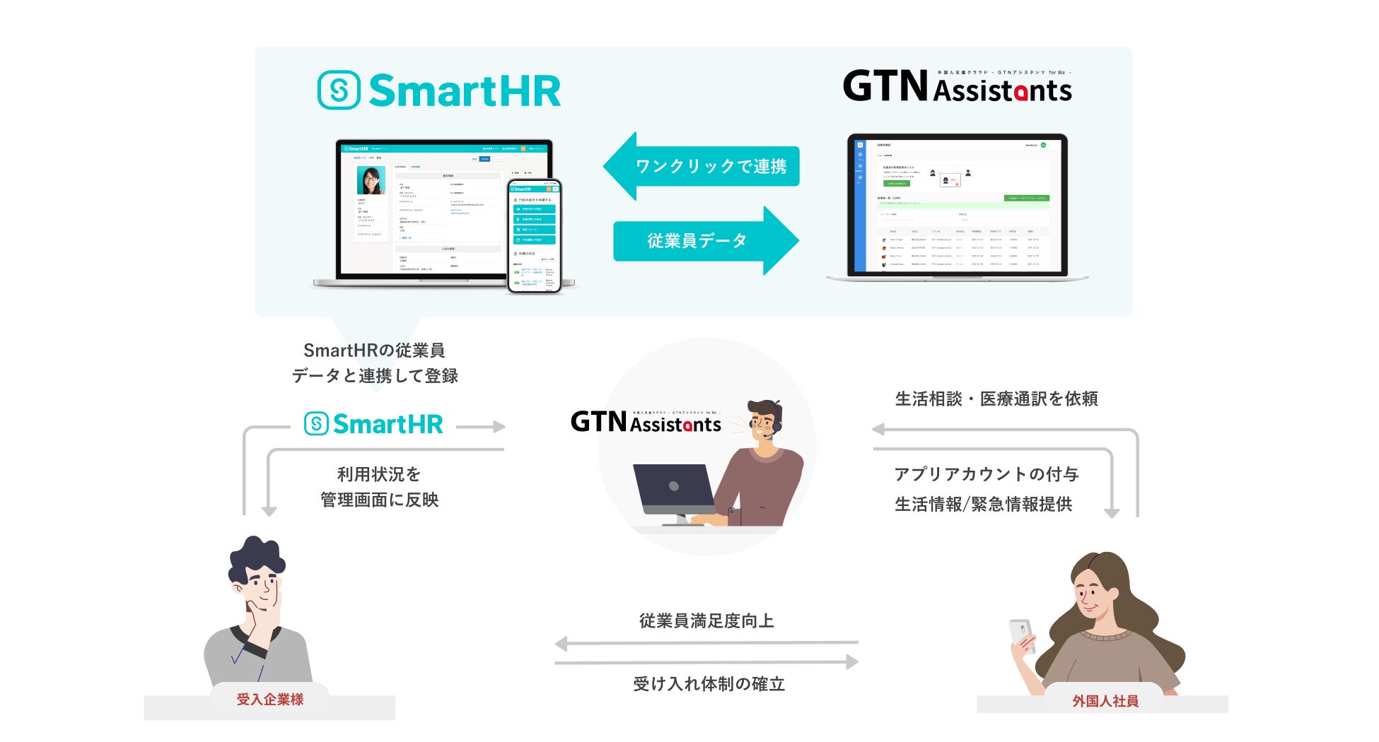 外国人支援クラウド「GTN Assistants for Biz」とクラウド人事労務ソフト「SmartHR」がシステム連携し協業を開始