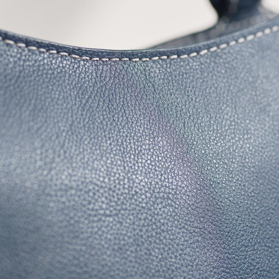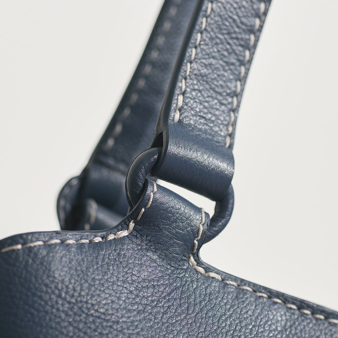 ハンドルと胴体をつなぐリングには金具を使わず、レザーでつくることで、ふっくらと優しい印象を細部まで感じていただけるようにしました。ハンドルの付け根は、特徴的な形にカットされたレザーと手縫いを組み合わせることで、胴体をリングに巻き付けハンドルとボディの美しい一体感をつくり、バッグ全体が継ぎ目なく、なだらかにつながっていきます。