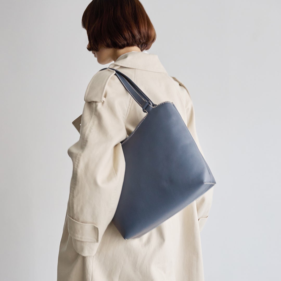 A4サイズが入り、お仕事でもカジュアルでも持ち歩ける「Yui Tote(ユイ トート)」。ななめに伸びるハンドルとカーブを描いた間口のラインが、心地よく身体にフィットします。