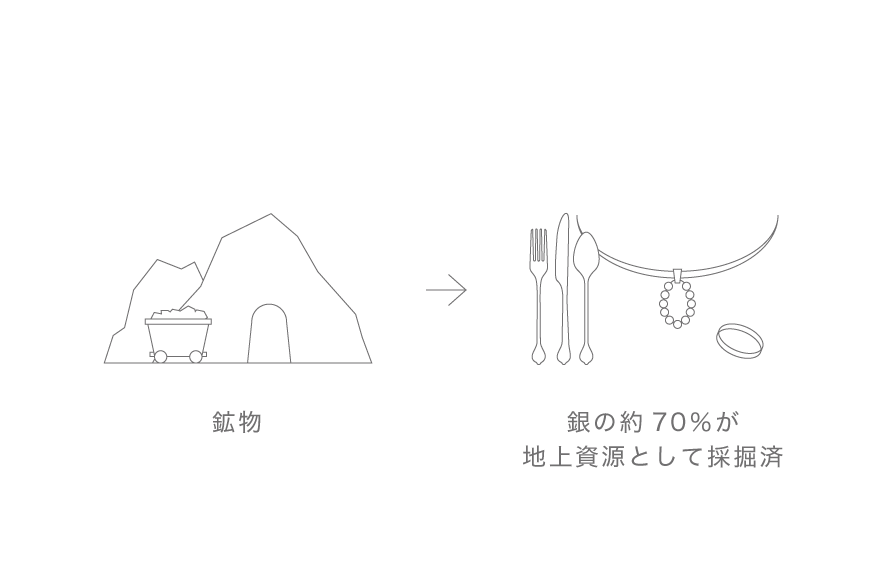 金・銀・銅等は、主に世界の鉱山を採掘して得られる天然資源です。これらの資源は、採掘された後、ネックレスや指輪等の宝飾品や、歯科治療用の金属、パソコン、携帯電話等に使用されますが、役割を終えた後に新たな製品に再生されることなく地上に眠ったまま(地上資源)になっていることがあります。世界全体で、銀は約70%が地上資源であり、ほとんどの銀はすでに採掘済みと推定されています。※1