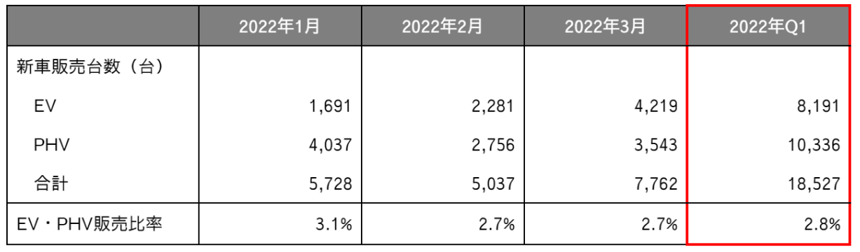 新車販売に占めるEV・PHV比率・台数ともに2022年1~3月期で過去最高を更新、新型EVの日本発売を控え2022年は更なる上昇に期待