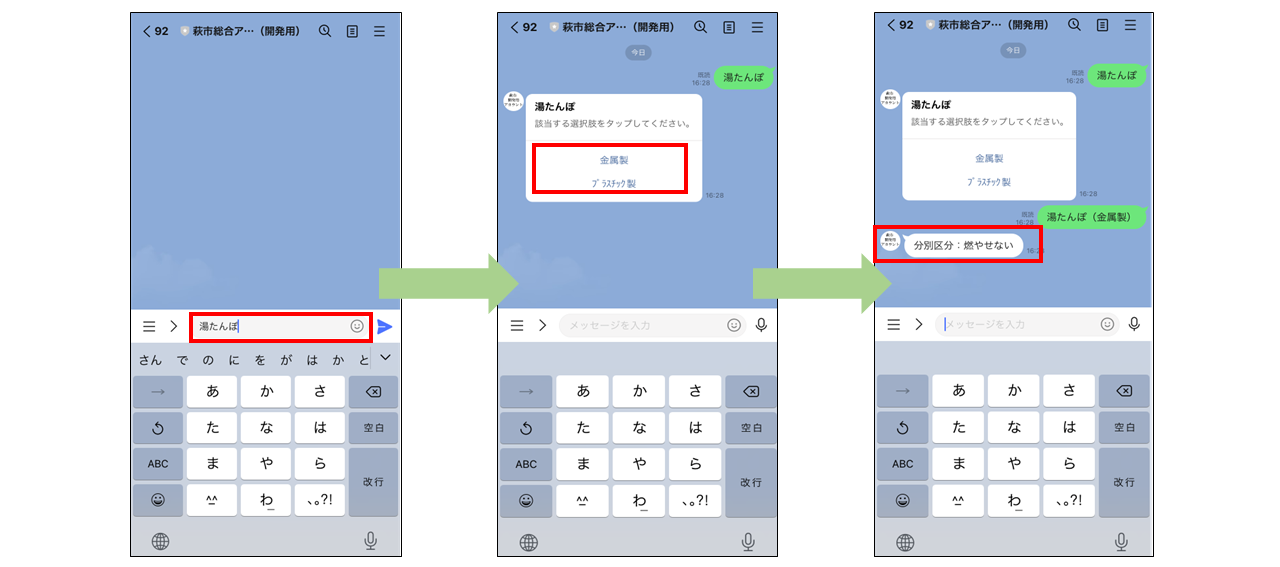 分別方法を知りたいごみの品目名をLINEのチャットに入力することにより、そのごみの区分と捨て方のポイントがチャットボットで自動返信されます。また、複数の区分が当てはまるごみの品目の場合、選択肢が表示されるため適切な区分を選択することができます。