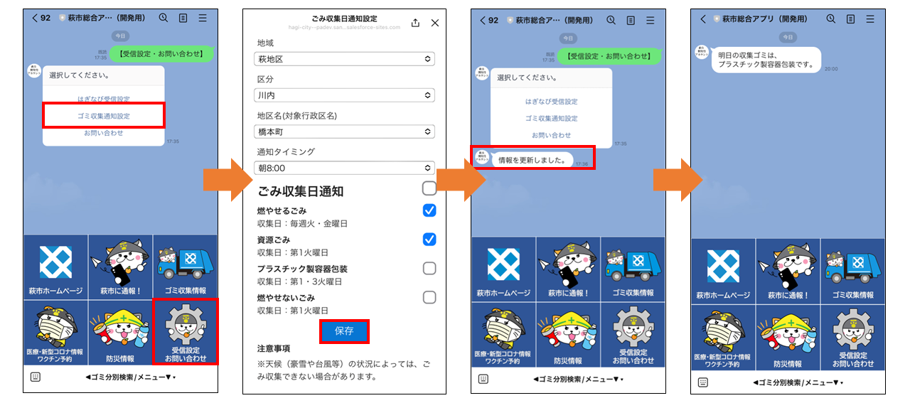 萩市民が事前に設定をした“収集日を通知して欲しい地域情報”と“ごみ分類”をもとに、ごみ収集日の通知を収集日の前日に行います。通知タイミングは、収集日前日の8時、12時、17時、20時で設定可能です。