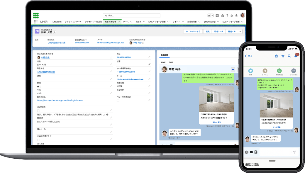 「PHONE APPLI LINER」はSalesforceとLINE、SalesforceとSMSをつなぎ、One to Oneコミュニケーションを実現し、顧客が欲しい情報を欲しいタイミングでお届けすることで顧客とのエンゲージメントを高めるSalesforce AppExchangeアプリケーションです。