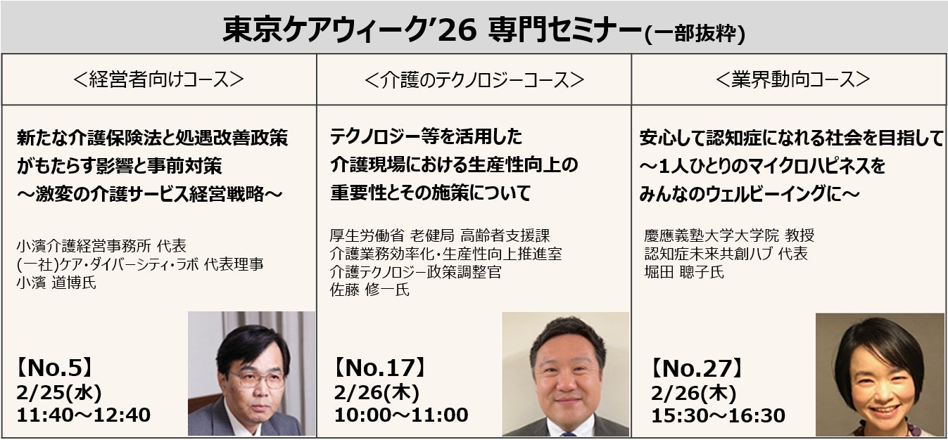 本展では、業界の第一線で活躍する専門家を講師に迎えた「専門セミナー」を同時開催する。経営者向けコースでは、介護経営コンサルタントの小濱道博氏が介護保険制度の最新情報を踏まえた経営戦略をテーマに講演。また、介護のテクノロジーコースでは厚生労働省の佐藤修一氏が生産性向上の取組を推進する各種施策を解説。その他、産福共創の保険外サービス、介護におけるAI活用、認知症共生社会の実現など、介護事業の課題解決に役立つセミナーが集結。受講に必要な事前申込(無料) は、公式サイトにて受付中。定員間近のセッションもあるため、早めの受講申込をおすすめする。