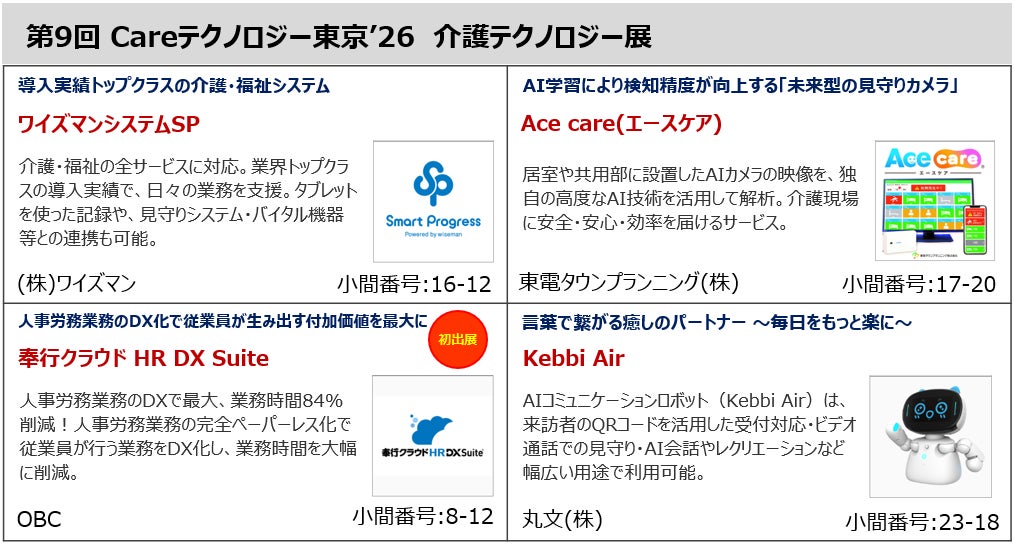 介護現場では、職員の負担軽減、人⼿不⾜への対応、より質の高い介護の実現など、多岐にわたる課題を最新のテクノロジーを駆使して解決しようとする動きが活発化している。本展には、介護事業所向けのシステム、⾒守り、ロボットなどの介護テックが一堂に集まり、新たなソリューションを提案する。