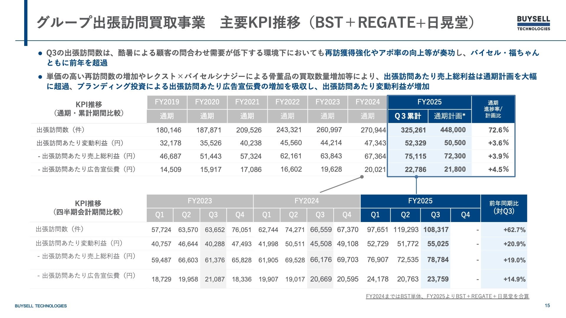 Q3の出張訪問数は、酷暑による顧客の問合わせ需要が低下する環境下ではありますが、リピート獲得強化やアポ率の向上等が奏功し、バイセル・福ちゃんともに前年を超過しました。
