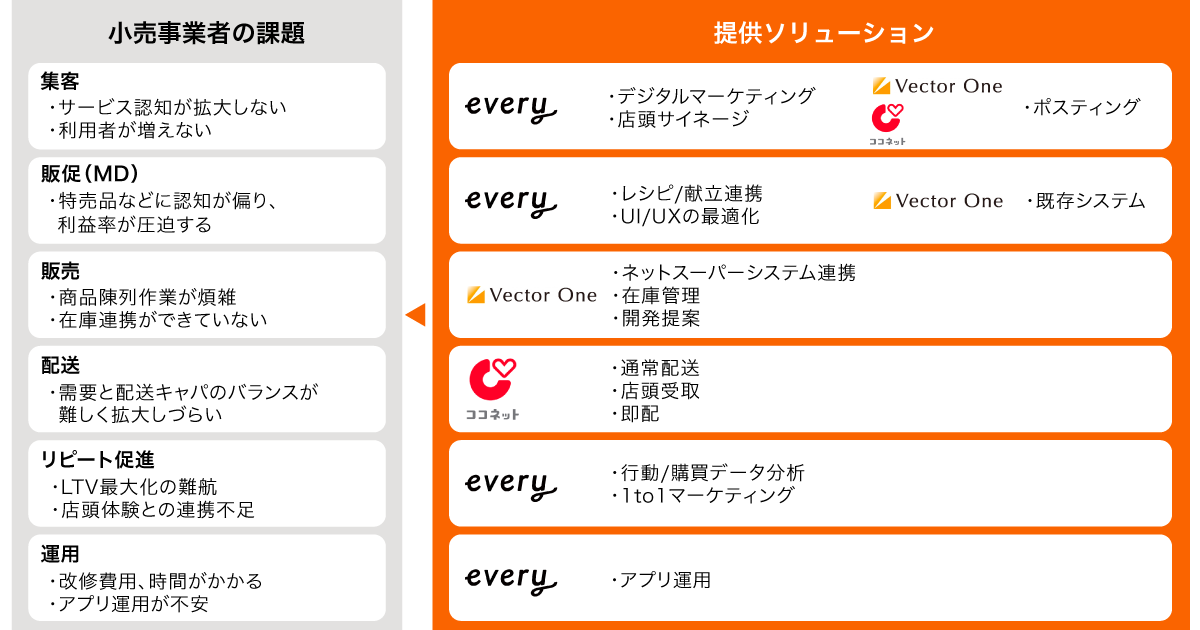 しかしながら、我々はネットスーパーにおける消費者の商品選びからリピート・定着に至るまでには、フェーズごとに課題が存在し改善の余地があると考えています。これらの解消を図るべく、エブリーは、ネットスーパーのシステム提供実績のあるベクトルワン、全国配送網の基盤を持つココネットと業務提携を締結いたしました。