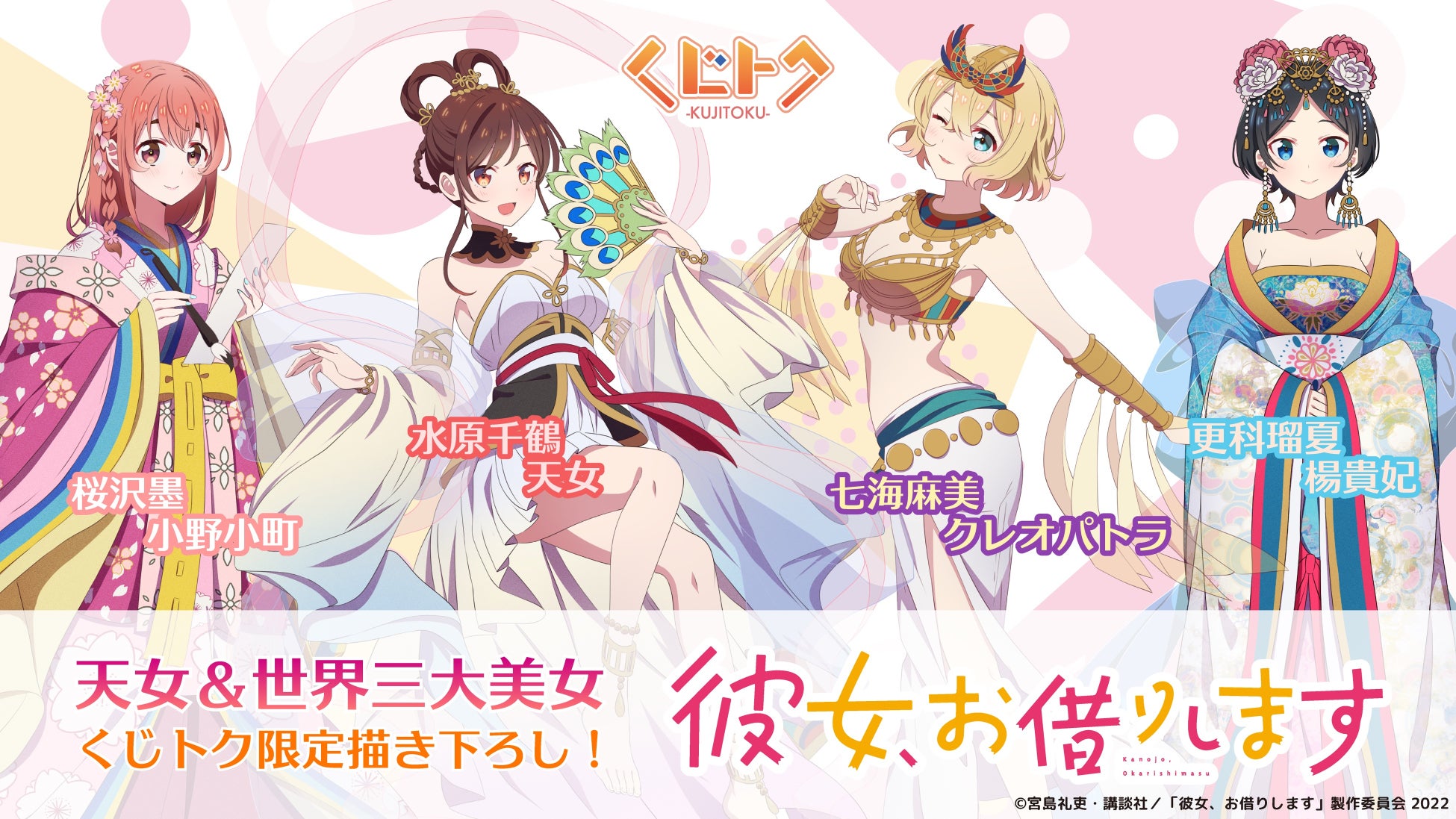 オンラインくじサービス『くじトク』より、『彼女、お借りします』がスタート!天女&世界三大美女をイメージした、オリジナル描き下ろしイラストの限定アイテムが盛りだくさん!