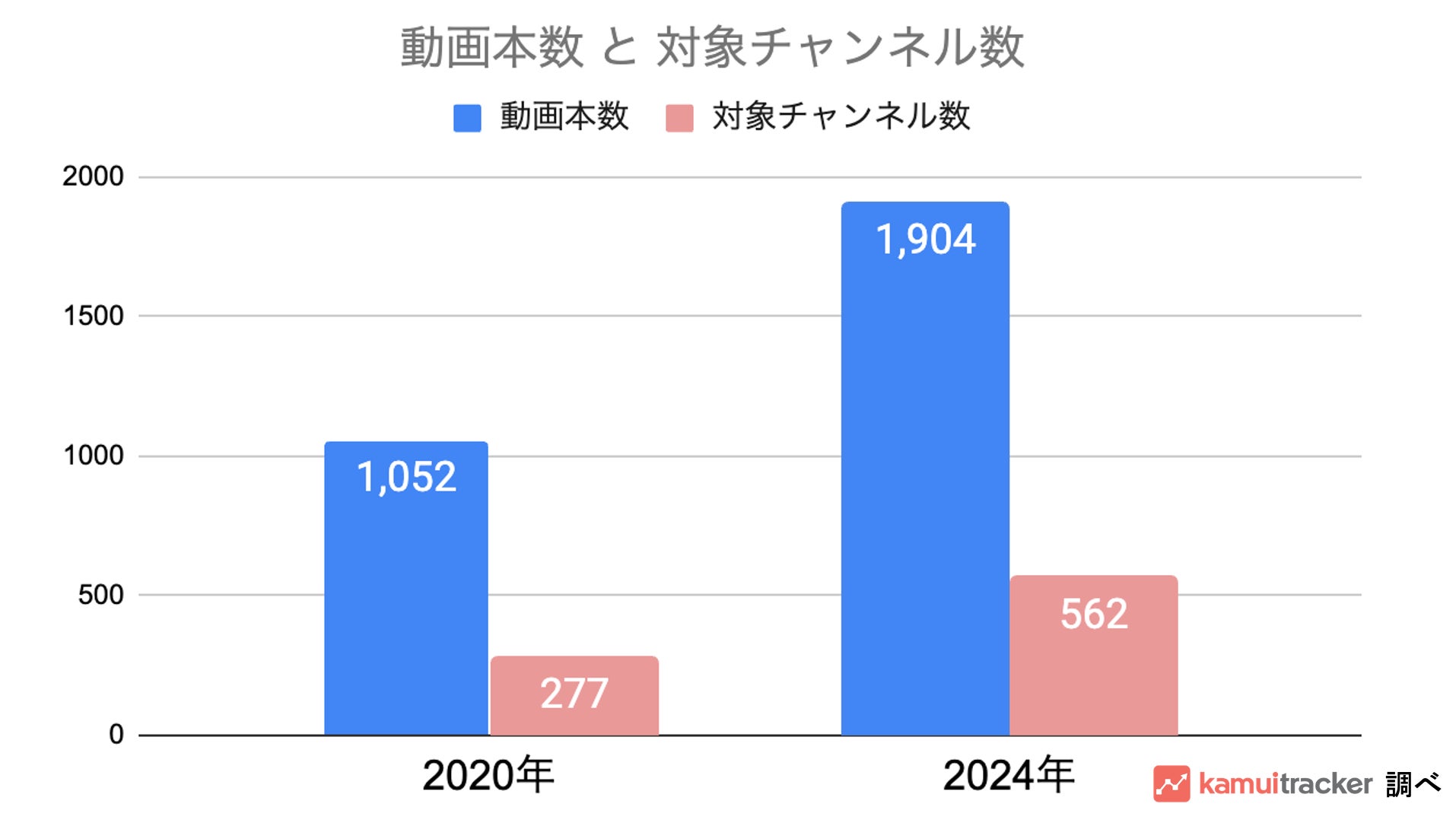 2020年は告示の6月18日から投開票日の7月6日の期間。2024年は告示翌日の6月21日から7月1日の期間で、動画のタイトルに「都」と「選」というキーワードが入る動画を検索した結果、前述の通りとなりました。対象期間が少ない中でも2024年は動画本数、チャンネル数ともに大幅に伸びており、都知事選がYouTubeを通じて注目されていることが分かります。