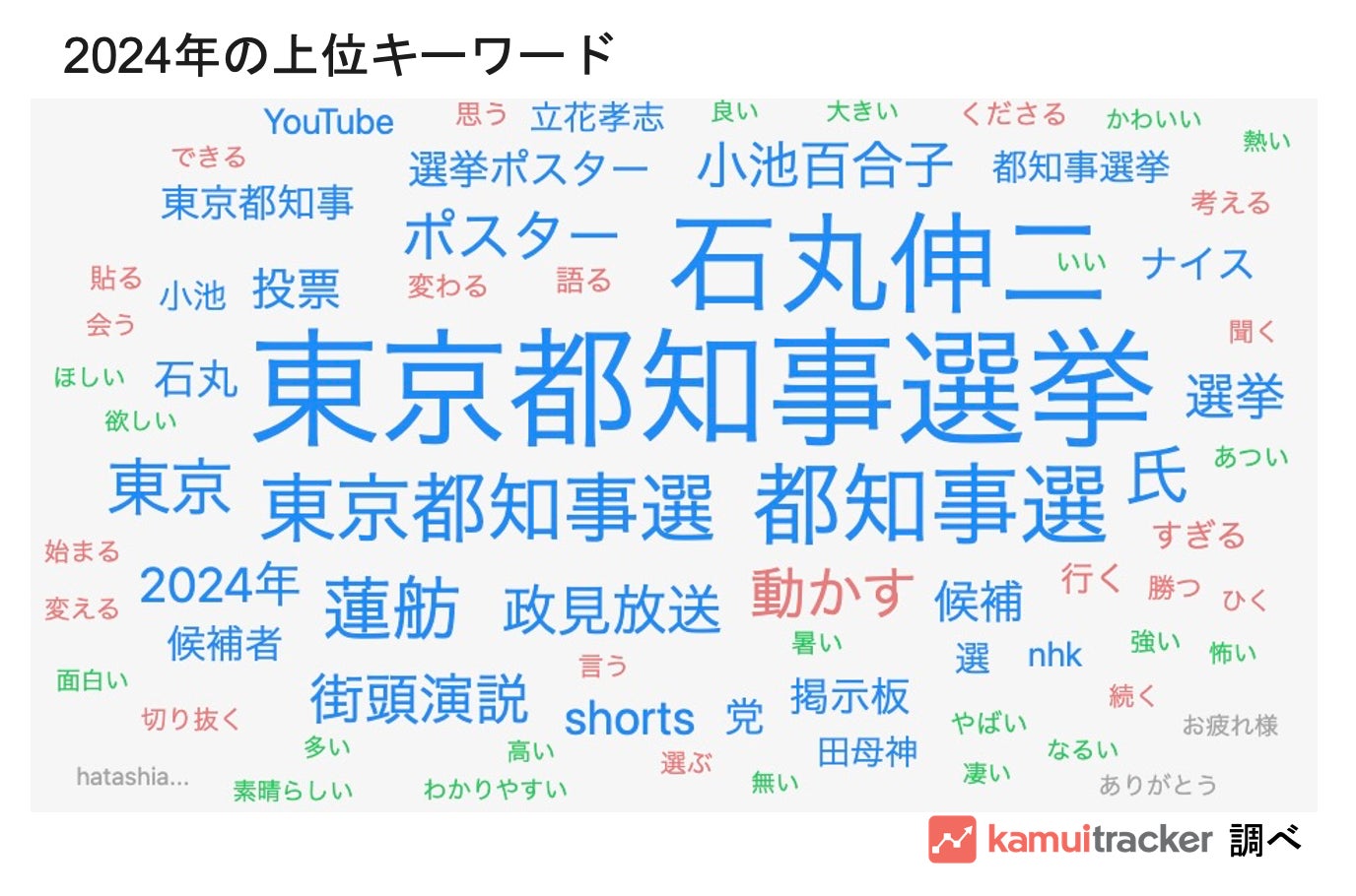 4年前にはほとんど登場しなかった「小池百合子」というキーワードも2024年は202回、動画タイトル内に出現しています。