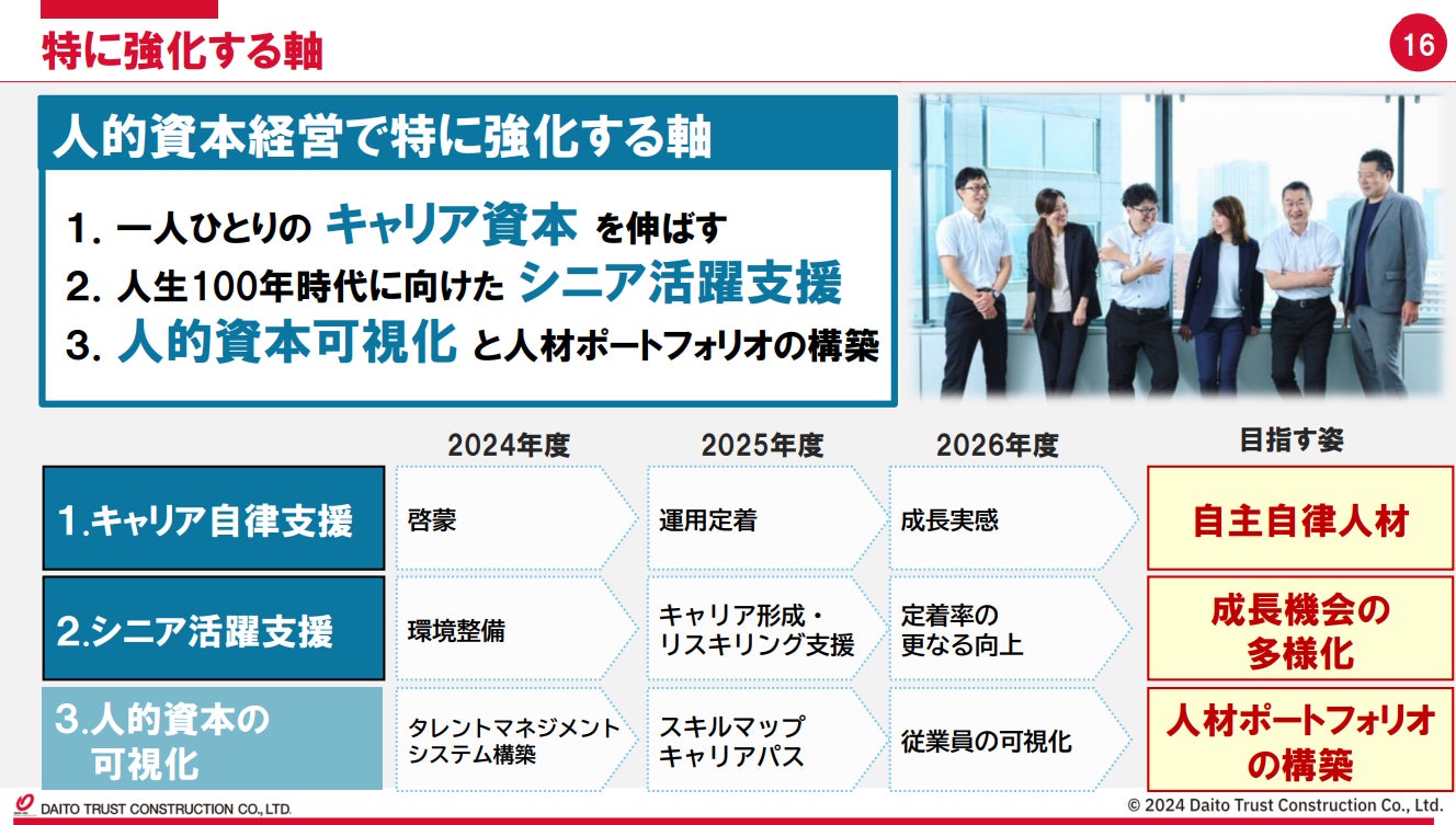 大東建託では、2024年度〜2026年度を対象とした中期経営計画の基本方針の一つとして、「人的資本経営の推進」を掲げており、その中で「働きやすさ」と「働きがい」という2つの環境を整えていくことで社員の力を最大化することを目指しています。