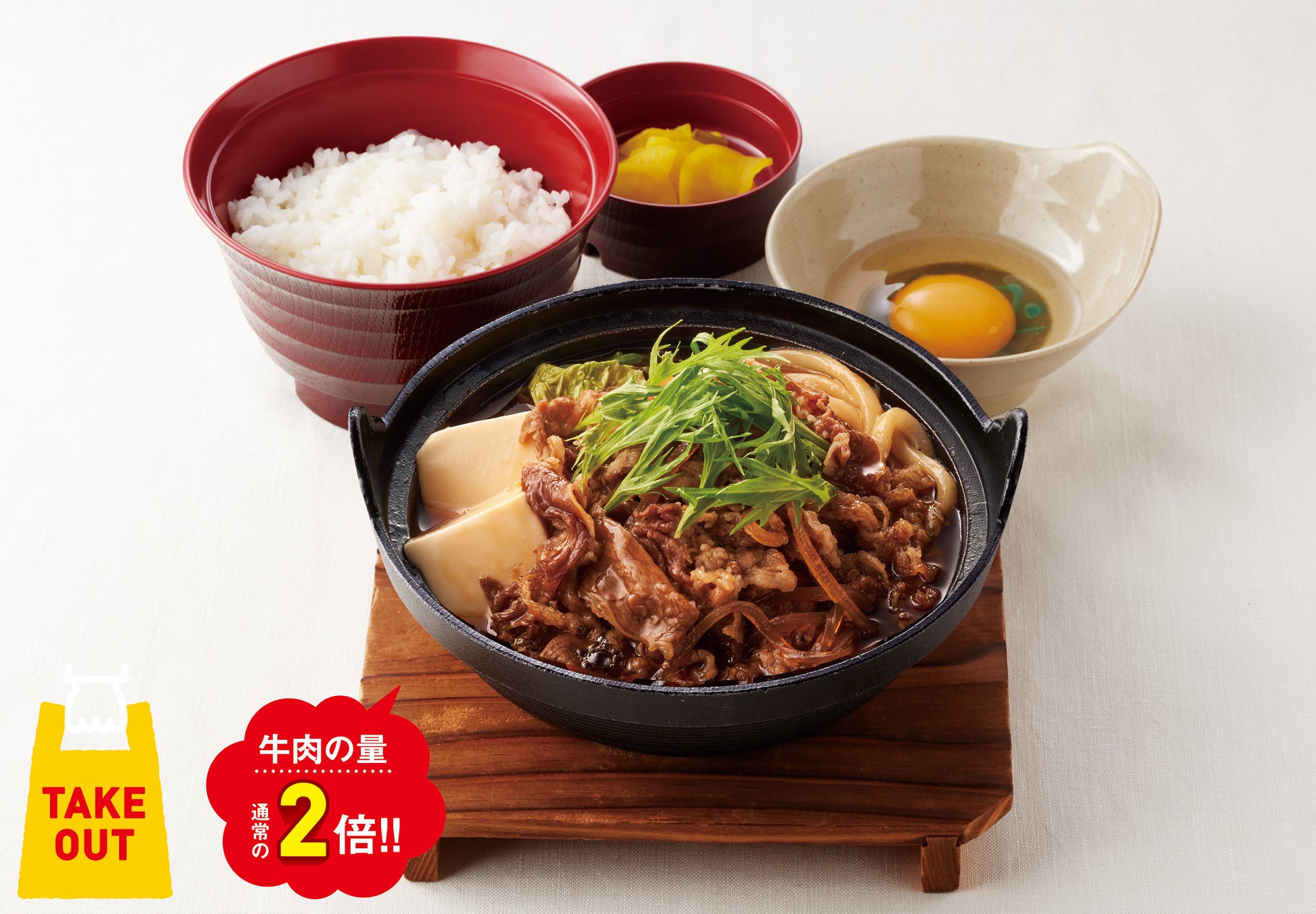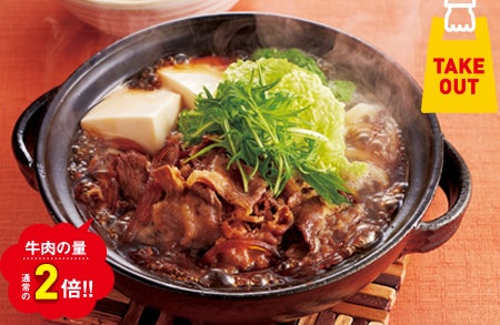 昆布・鰹のエキスが効いた割下が、牛肉と野菜によくしみています。卵を絡めてお楽しみください。