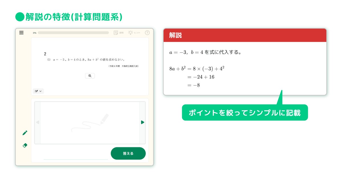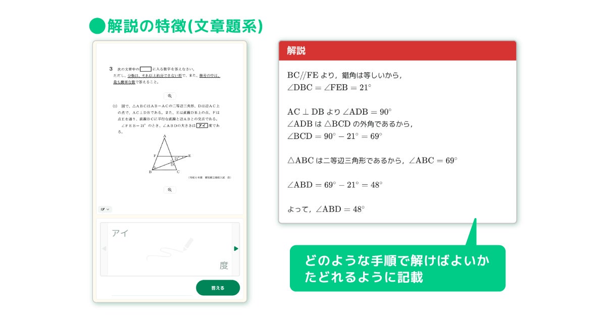また、6月にリリースした「高校入試の過去問題」では、高校入試の実戦演習を想定し、先生による指定配信に限定したコンテンツ仕様になっておりますが、新コンテンツ「高校入試の練習問題」では、先生による指定配信だけでなく、子どもたちの学習画面から子どもたち自身が問題を選んで取り組むことが可能です。さらに、問題ごとにわかりやすい解説を搭載し、子どもたちによる自律的な力試しの機会として活用いただけます。