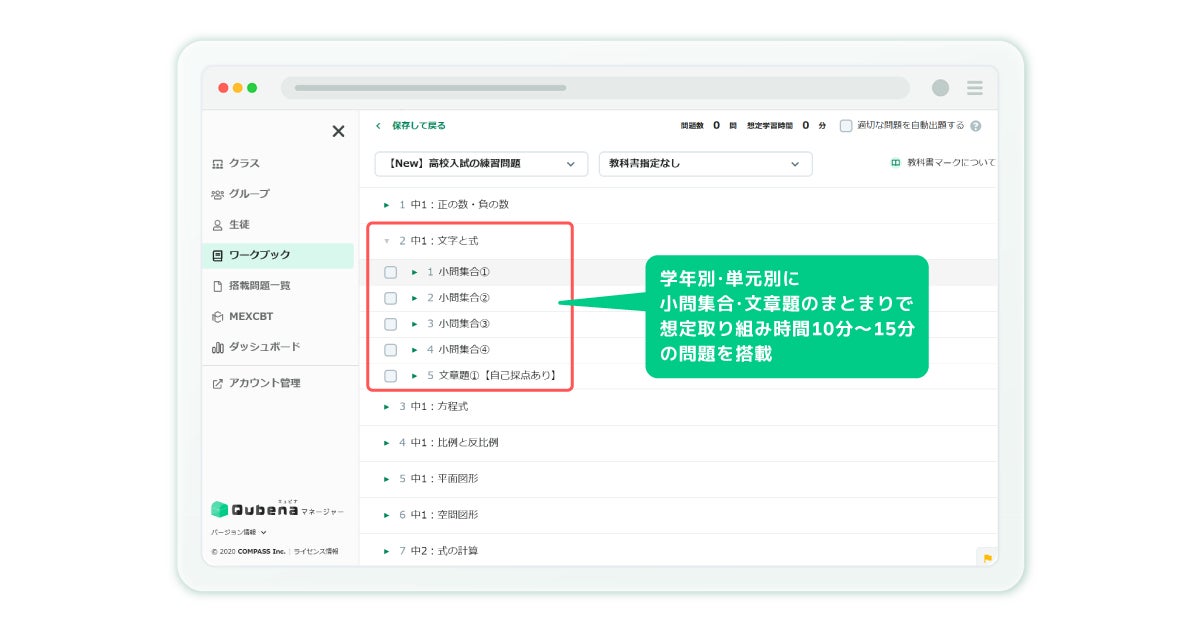 学習eポータル+AI型教材「キュビナ」を開発・提供する株式会社COMPASS(本社:東京都文京区、代表取締役:佐藤 潤、以下 COMPASS)はこのたび、キュビナの新コンテンツとして実際の高校入試の問題で子どもたち自身が自律的に応用問題演習に取り組むことができる「高校入試の練習問題」をリリースしましたことをご報告いたします。本コンテンツの対象教科は数学で、学年別・単元別の目次で実際の高校入試の問題を搭載し、知識の活用力・思考力を高めるトレーニングとして日々の学習に活用いただけます。