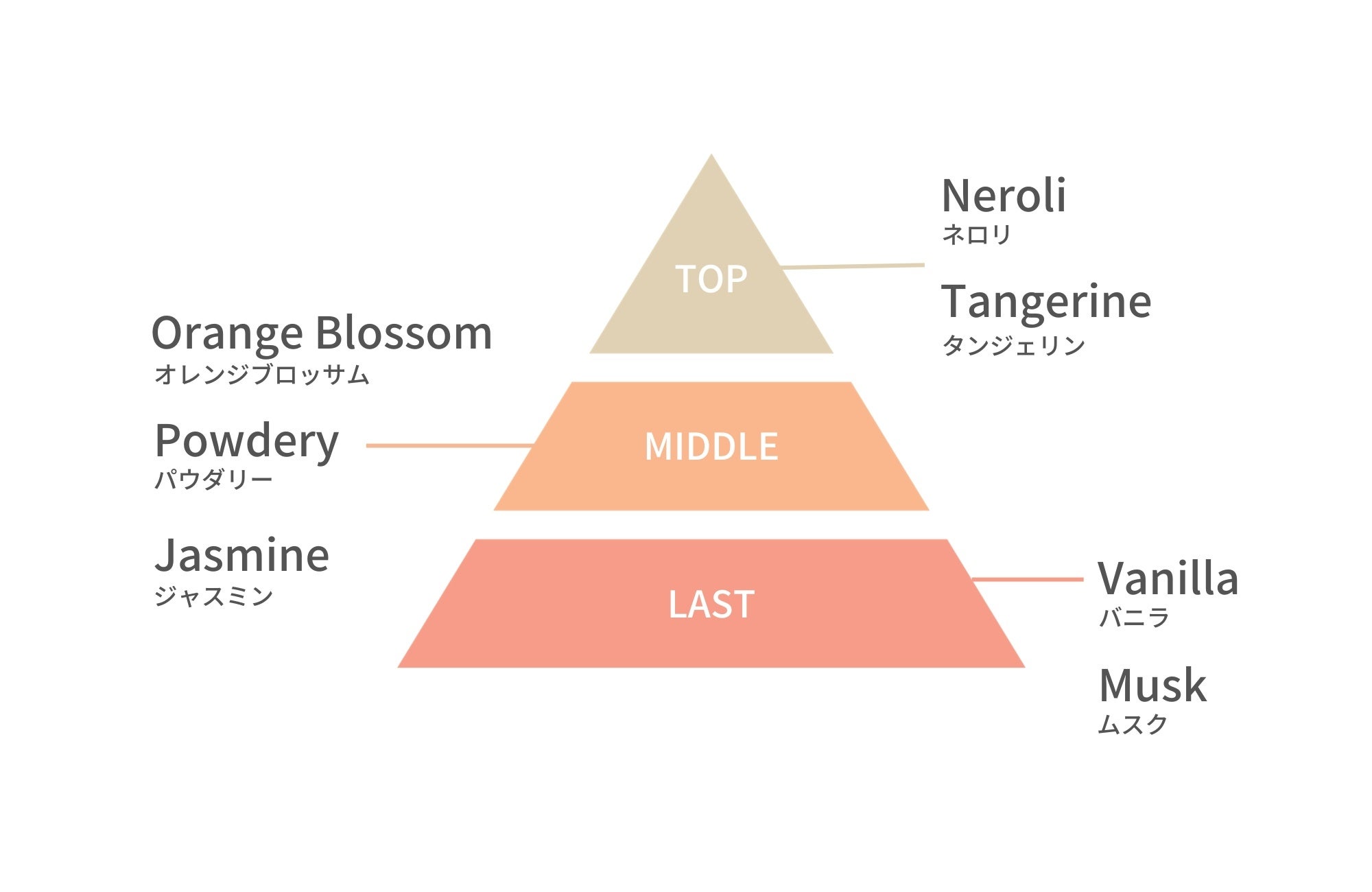 ほのかに甘いパウダリーな香調に、ネロリやジャスミンがやさしく溶け込む、優雅なネロリパウダーバニラの香り