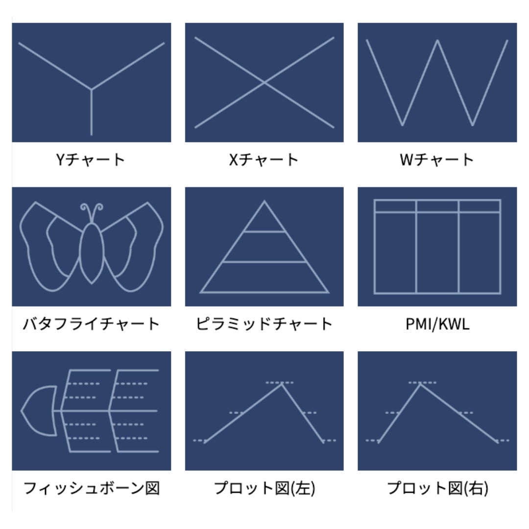 シンキングツールは「比較」「分類」「関連付け」などの思考スキルの活用を促す図です。シンキングツールを使って情報や考えを整理することで、他者の意見との比較や共有がしやすくなり、新たな考えや気づきを得られます。