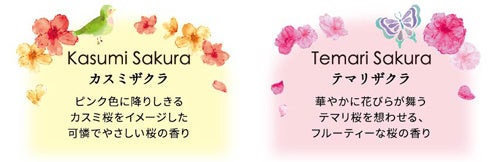 可憐でやさしい桜の香り広がる「カスミザクラ」と、フルーティーな桜の香りが華やかに広がる「テマリザクラ」の2種の香りが楽しめます。