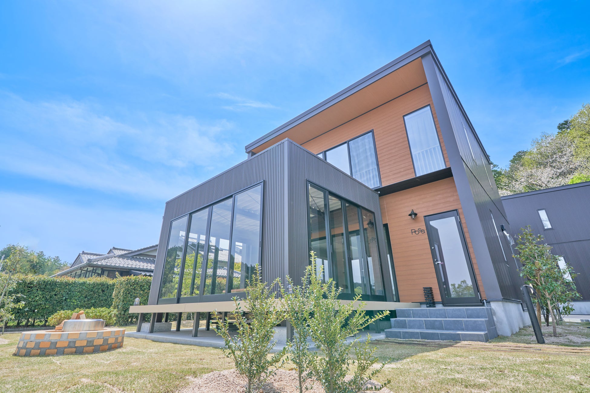1棟貸切型のプライベートヴィラは、伊吹山の麓にあり、季節ごとに表情を変える伊吹山や緑豊かな自然を眺めながら、家族や仲間でゆったりと過ごせます。