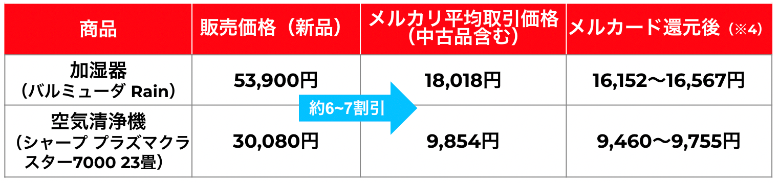 大手家電量販店のECにて、「加湿器(バルミューダ Rain)」や「空気清浄機(シャープ プラズマクラスター7000 23畳)」の販売価格を調べたところ、それぞれ53,900円、30,080円となりました。(※2) また、「メルカリ」で取引された同一商品の平均取引価格(※3)を調べたところ、それぞれ18,018円、9,854円となり、約3〜4割の価格で取引されていることがわかりました。リユース品を上手に活用することで、既に出費を抑えることができますが、加えてメルカードを利用して「メルカリ」「メルカリShops」内で商品を購入すると、1%〜最大4%ポイントが還元される(※4)ため、さらにおトクに購入することができます。