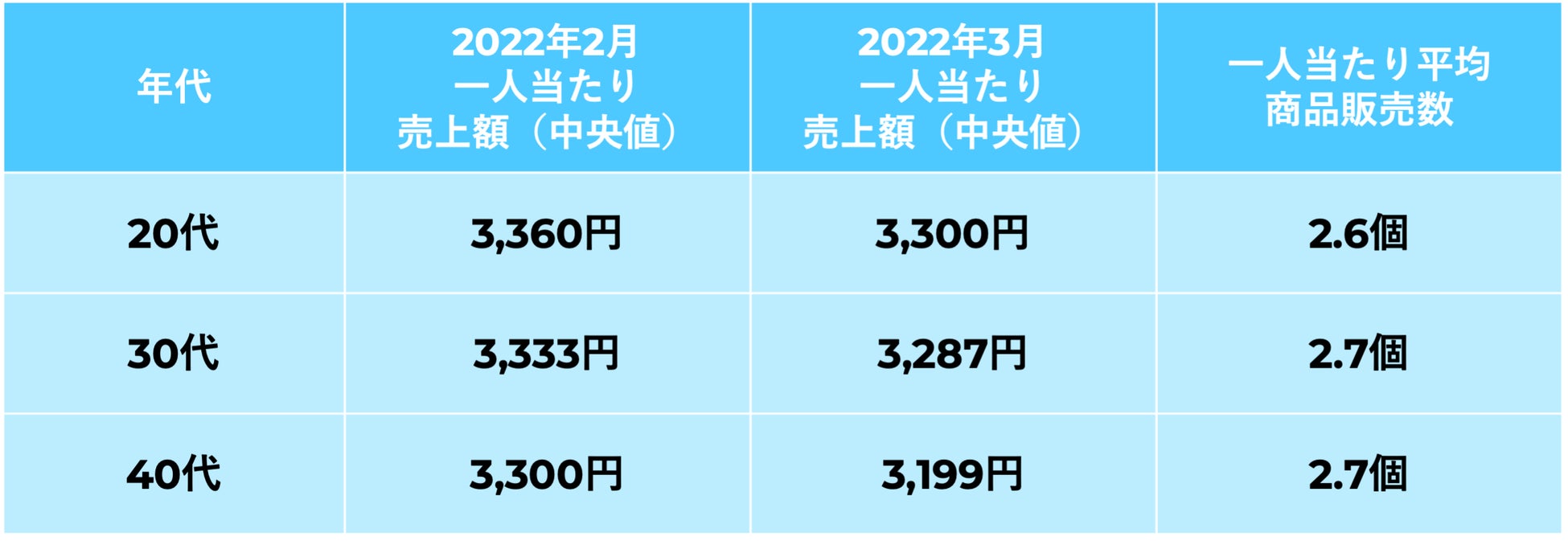 実際に「メルカリ」を活用して水道光熱費がどの程度補えるのかを検証するために、「メルカリ」の取引データから、2022年2月・3月単月における1人当たりの売上額(中央値)を年代別で算出したところ、20〜40代では3,300円前後の売上額があり、水道光熱費が最も上がる2月でも水道光熱費の約1割を補えることがわかりました。