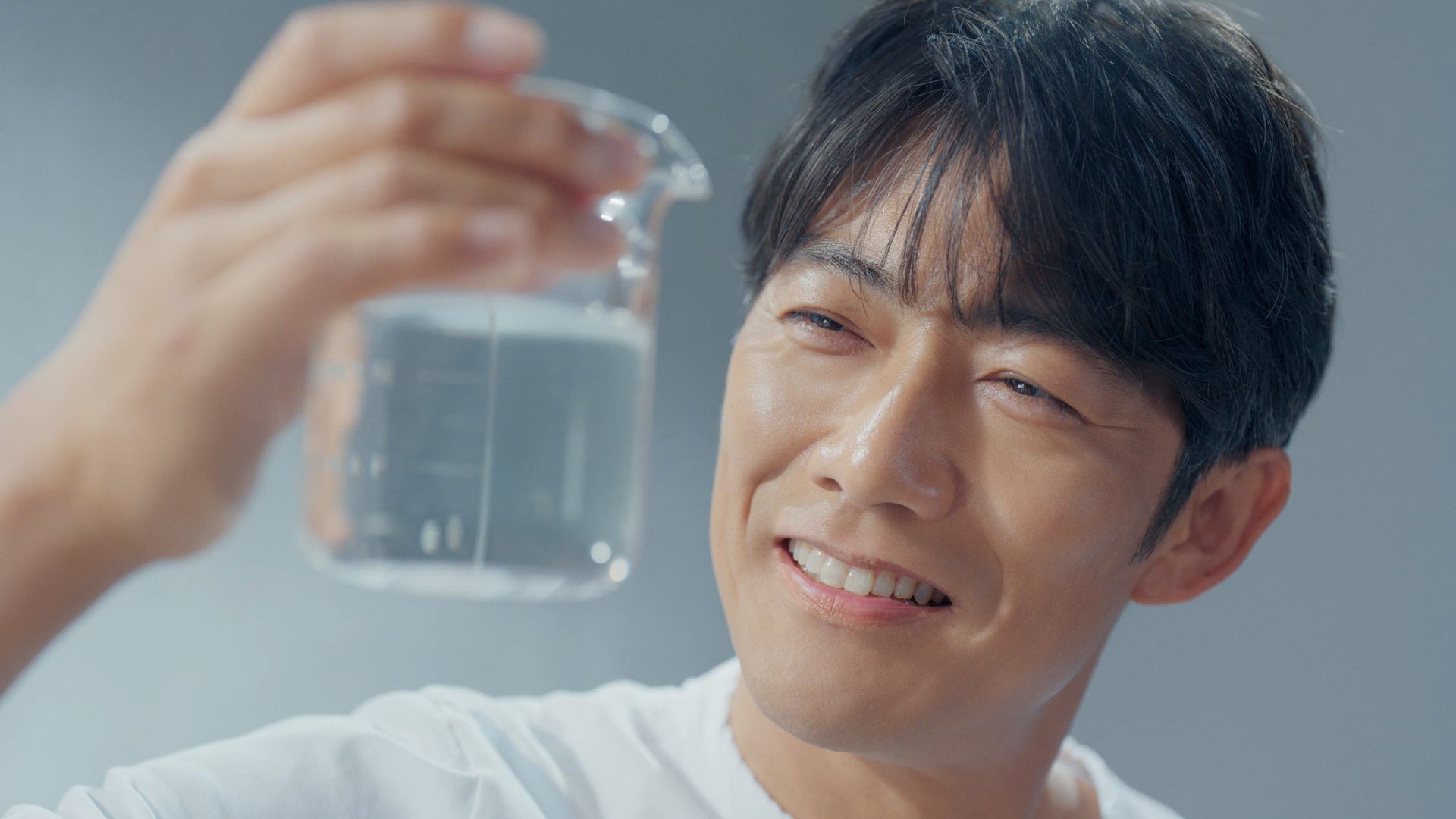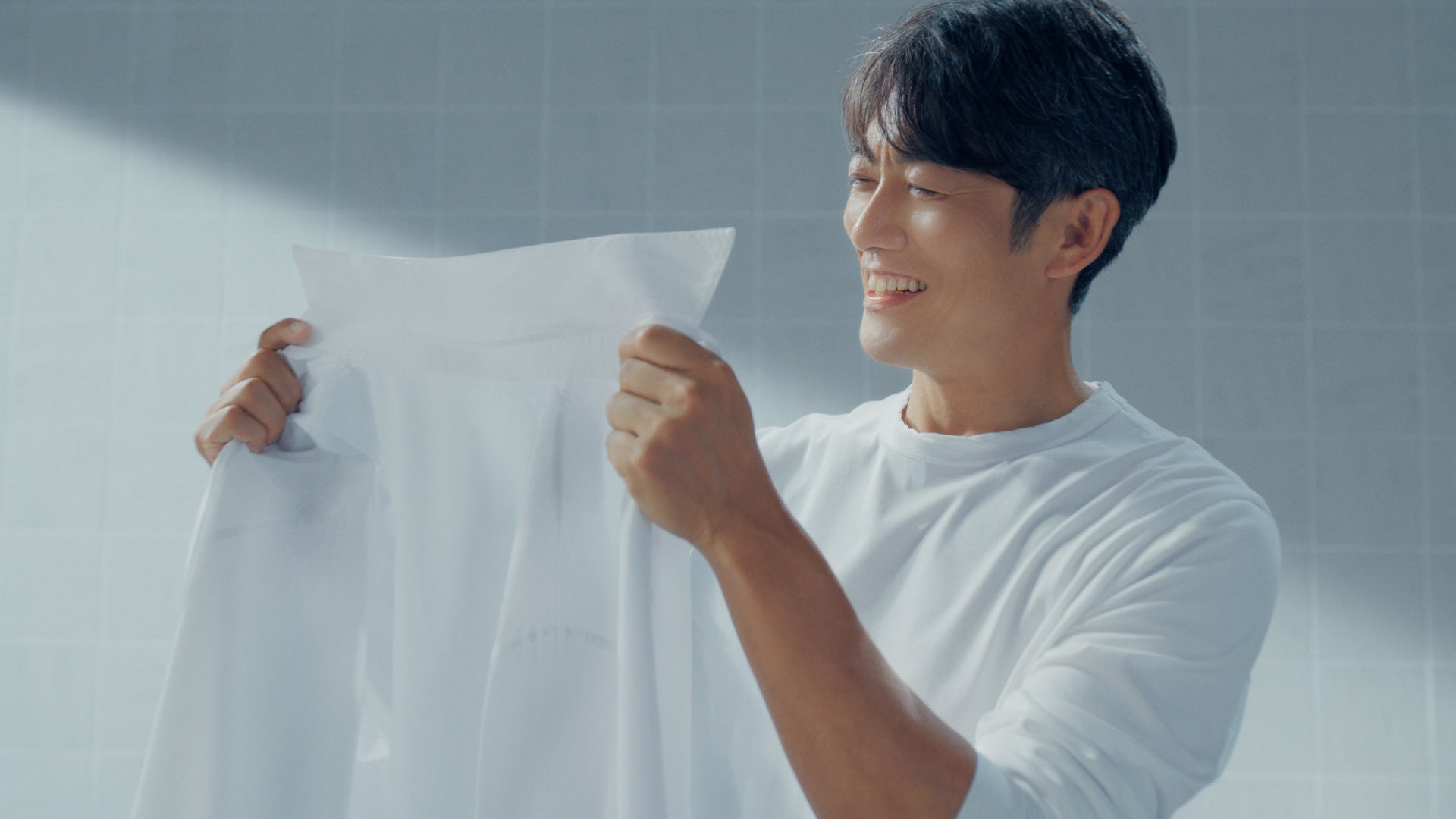 反町さんがビーカーを手に取り、「水道水よりも、もっと洗える水があるはずだ。」と、より良い洗濯を追求する想いを語るシーンからスタートします。繊維のすき間よりも小さいナノサイズの泡が洗浄効果を高める、洗濯機「ZABOON」の「ウルトラファインバブル洗浄」を紹介。洗いあがったシャツの「かつてない白さ」に、反町さんが満足そうに微笑む姿を通して、日々の洗濯を革新する技術力を伝えます。