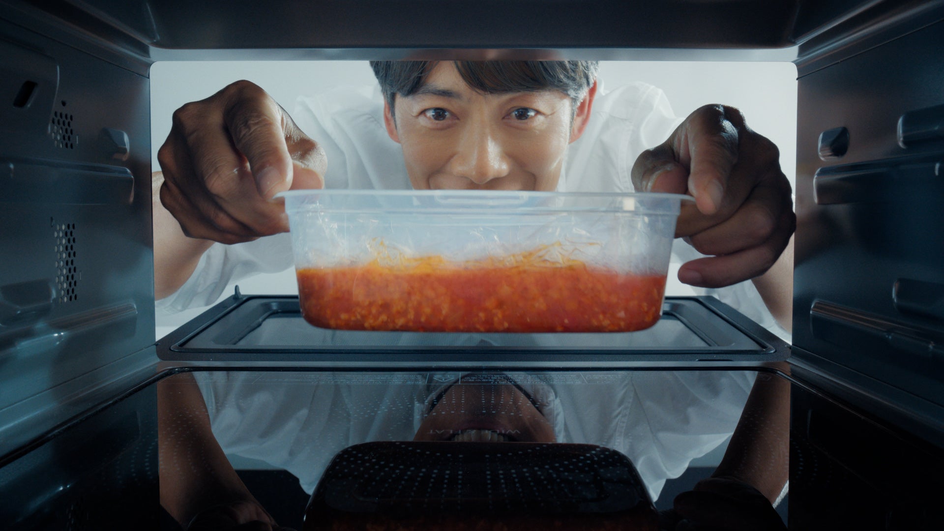 「レンジのあたため、冷たいところがときどき残る。」というナレーションと共に、反町さんが温め直した料理にスプーンを入れると、まだ冷たい部分が残っている、という多くの人が経験するシーンから始まります。オーブンレンジ「石窯ドーム」の「ファインeyeセンサー」が、従来比約3倍の精度で食品の状態をきめ細かく検知して、あたためムラを抑える様子をCGで紹介。ムラなく、おいしく温められたミートソースを嬉しそうに食べる反町さんの姿を通して、日々のちょっとした不満を解消する便利な機能を伝えます。
