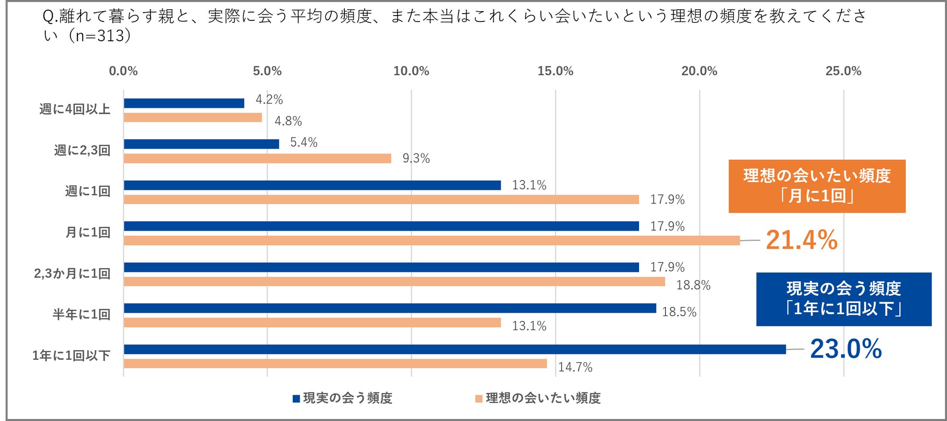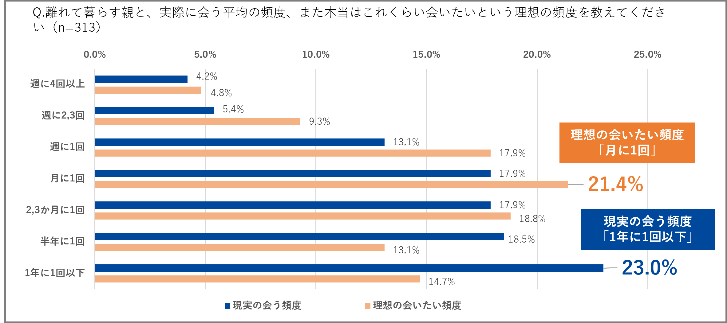 しかし理想の会いたい頻度の最多は「月に1回」が21.4%と、大きなギャップがあることが判明。