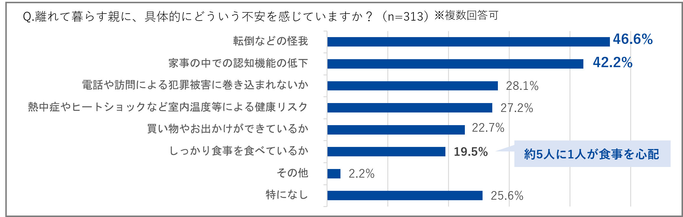 続く「家事の中での認知機能の低下」42.2%、「電話や訪問による犯罪被害に巻き込まれないか」28.1%の結果を見ると、離れて暮らすため未然に防ぐことに限界がある事件や事故について、不安を感じていることが分かりました。また、5人に1人が食事をしっかりとれているかを心配しており、今回の調査対象は60歳以上の親を持つ方でしたが、親の年齢が高くなるにつれてこれらの不安はより大きくなると予想されます。