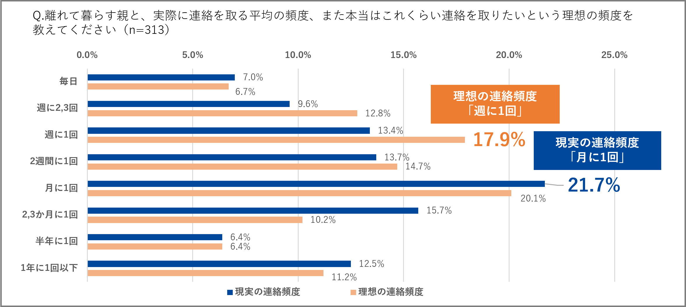 連絡を取る頻度についても調査。理想の連絡頻度を伺うと、「週に1回」が17.9%で、約7割が「月に1回」以上は連絡を取りたいということが分かりました。しかし、実際の連絡頻度は「月に1回」の方が21.7%と一番多く、5割以上が 「月に1回」かそれよりも低頻度であると回答されました。本当は連絡を頻繁に取りたいと思っていても、実際はそこまで連絡が取れていない状況である方が多いことが判明しました。